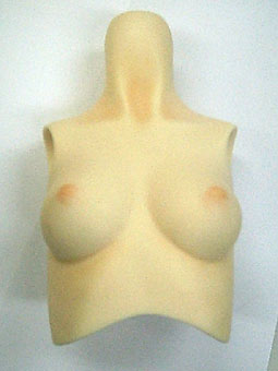 右はパステルの基本セットの赤茶をやすって首筋と胸の下、みぞおちの辺りに影を付け、赤茶とピンクを混ぜたものでおっぱいを塗ってみました。 |