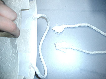上の写真の切り離した上半分のとこについている紐の持ち手を紙袋から剥がし、買ってきた白い紙テープで下半分の上に適当に貼り付けます。 |