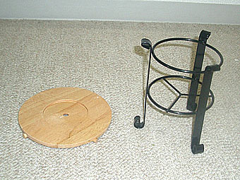 左は金具を外した時計盤と、植木鉢立て。人間の椅子は高さが60センチ弱なので、1/3サイズのSD用に作るには、15センチから18センチくらいの高さの植木鉢立てがあればよろしいかと。 |