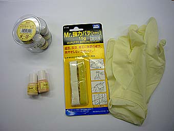 イヤ、私サフルのいまいち自信がないので、もしかパテの色がキャストの色に近くなったら、目元とか唇の中とか、上からメイクする所にしか使わないんだから、サフらなくてもうまいことごまかせないかしら……という下心がありまして……。 パテを練ってみると、結構固いです。水をつけながら柔らかくしつつ練っていきます。途中でこの濃い方の肌色をパテにちょんちょんと載せながら練っていきます。結構手袋の方に絵の具がくっついてしまうけれど、地道に水をつけながら練っていくとそのうちちゃんと混ざるようです。 色は完璧に似てなくても良いのです。っていうか、完璧に似せることは不可能です。なので、こいつを盛っていきます。