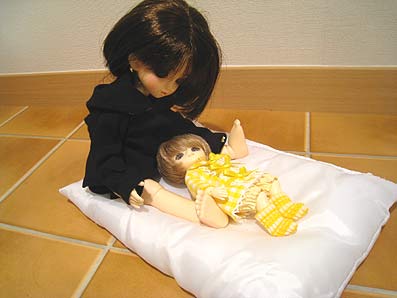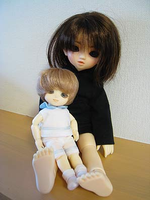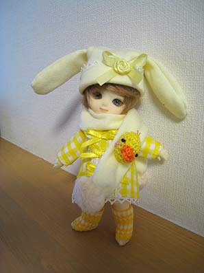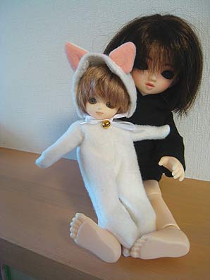 | 話すとちょっぴり長い話です。 まず最初に、相方の夏帆ちゃんが「ポケットフェアリーを買いたいんだけど」と言い出したときには、正直某楠しか見てこなかった私は韓国ドールはお化粧の感じとか日本と違って、そんなに欲しいとは思わないかも……と思っていました。サイトも教わって見てみたのですが、イマイチピンと来なかったのです。 それ以上に今いる3人のドールに入れ込んでいるので、これ以上ドールは増えなくてもいいや、とも思ってました。新しく増やすとしたら某楠でMSDをフルチョしよう、とか。18番ヘッド欲しいけど、どんなメイクにして貰おう、とか。でもやっぱり増えなくても良いかなぁ、とか。 でも夏帆ちゃんが実際にポケットフェアリーを入手してその写真を見たら、やっぱりこの小ささは可愛い!でも販売サイトを見ても、なんとなくピンと来なくて、「もし買うならメイクをやり直そうかな……顔の造形はそんな嫌いじゃないんだし」と、そのくらいには心を動かされ始めまして。 で、ヤフオクでなんとなく「ポケットフェアリー」の検索をかけたら、ちょうどコレクターさんが大量にポケットフェアリーを手放したらしく、ポケットフェアリーが20体近く載っていたのです。で、値段は中古だから当然安い。ちょっとビビリの私には海外通販は敷居が高いけど、ヤフオクで中古ならそんな怖くないし……。 で、色々見ていたら、中に1人、メッチャ好みのメイクの子がいたのです! でも人形増やすのはなぁ……。夏帆ちゃんに電話で相談したり、色々話していたのですが、その際一緒に見ていたポケットフェアリーの手作りのお洋服の方にいかれてしまいまして。 「何このお洋服!すごい可愛い!!うわ!このお洋服着てる小さい人形が我が家にいるって、それだけで何か嬉しくない!?」 そう思い、つい洋服を先に落札……。人形の落札日より洋服の落札日の方が1日早かったのですが、「人形が落札できるかどうかも分からないのに服落札するってどうなのよ!」とかい言いながら、それでも落札してしまいました。もしあのドールがゲットできなかったら、海外通販で自分でメイクをやり直そう!と思いながら、ドキドキしながらドールも入札。同じ方の作ったお洋服を他に2点と、他の人の作ったネコの着ぐるみも一緒に入札掛けました。 そしたら無事5点とも落札。ドールは4件入札が入っていたので、最初に見た値段より8500円も値上がりしてしまいましたが、それでも定価より大分安いので、まぁ良いか、ということで。 で、ドキドキしながら届くのを待っていました。発送先との距離があるので、最初に届いたのはネコの着ぐるみ。「うぉ〜!可愛い!早く着せたい!」と思いつつドールが届くのを待ちます。翌日にはお洋服とドールが到着。ドールが到着したときにはママ友がお子さん連れて遊びに来ていたのですが、お互い相手がタクだって事は知ってるので(失礼ι)、お友達ほったらかして人形取り出して着替えさせて写真撮りまくってしまいました……。子供達はそんなに違和感もなく「わ〜お人形だ〜!見せて見せて〜!」とやっていたのですが、さすがにママ友の方は引いたかも……orz